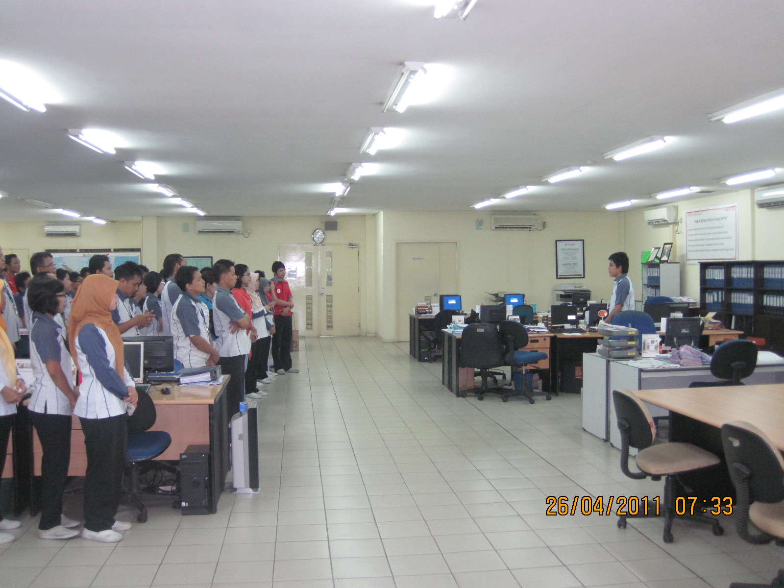 Di kantor kami setiap hari Rabu pagi, pas setelah bel masuk berbunyi, sebelum para karyawan memulai aktivitasnya, secara bergantian seorang manager lokal atau yang lebih tinggi harus memberikan wejangan pagi untuk semua karyawan yang lain, dan dilanjutkan dengan Yel-yel pagi khas perusahaan kami.